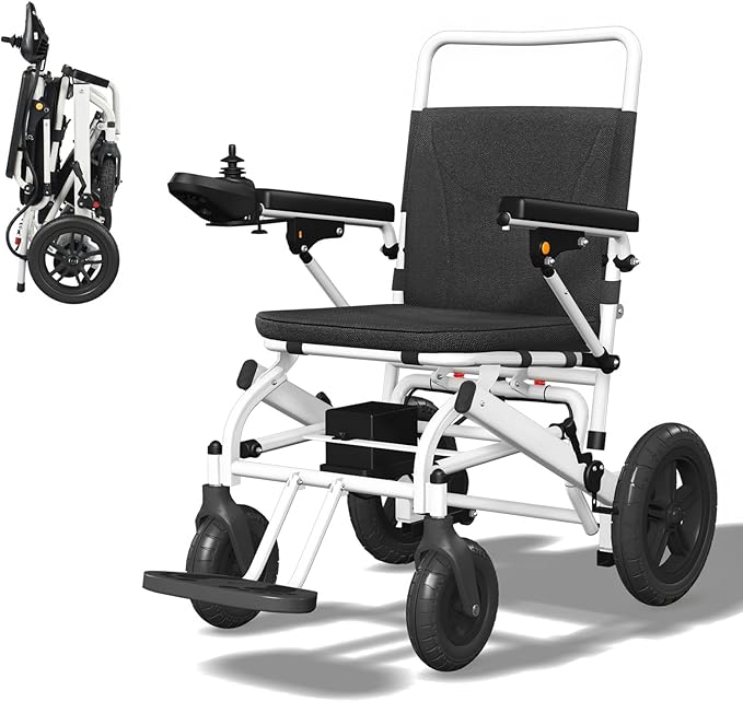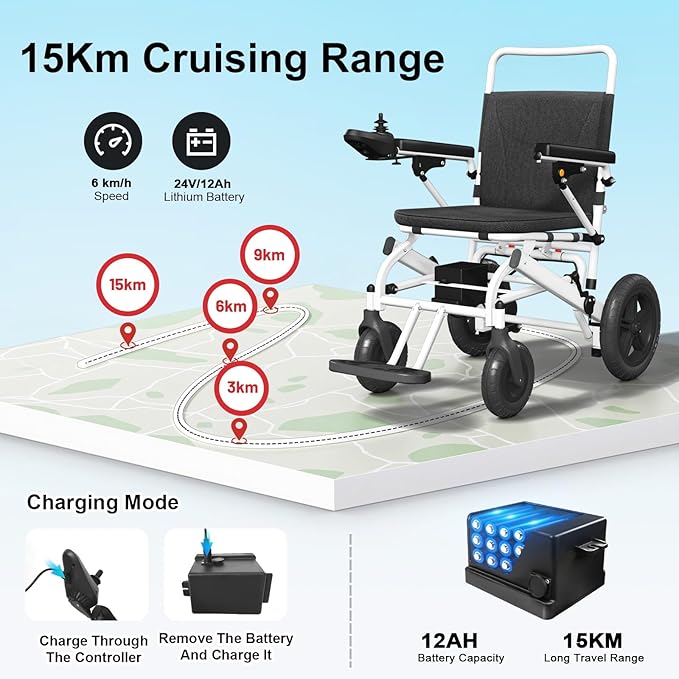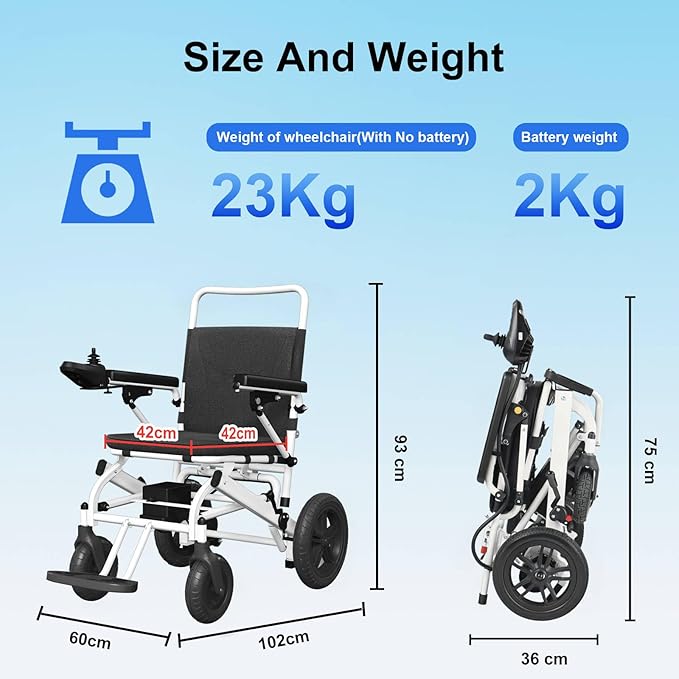 Foldable electric wheelchair that combines portability and durability. It features a high-carbon steel frame that ensures structural strength while keeping the total weight of the wheelchair to just 23 kilograms (excluding the battery), making it extremely convenient to transport and carry. When folded, the wheelchair can be pushed out directly, eliminating the hassle of manual lifting. Whether stored in a car boot or placed in a corner of the home, it takes up minimal space.