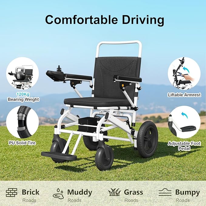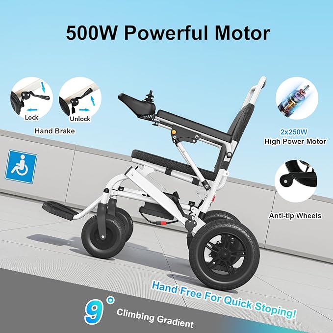 Carbon Steel Frame Electric Wheelchair, Light Weight at 23Kg (Without Battery), Adult Mobility Chair, 500W Powerful Motor, 12Ah Lithium Battery, Suitable for Multiple terrains (White)