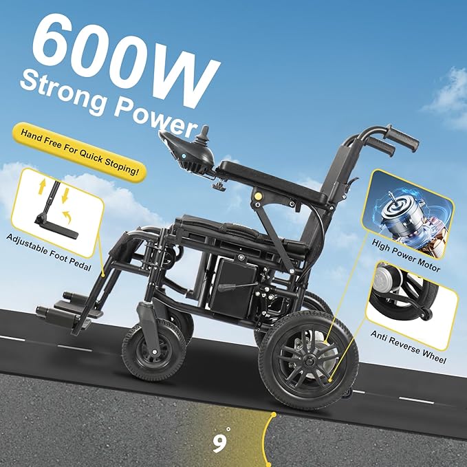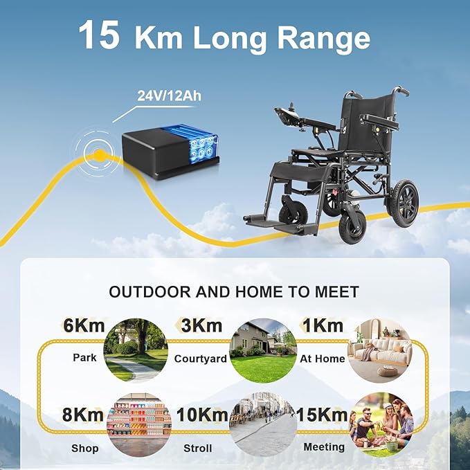 Power wheelchair is equipped with dual 600W high-power motors, providing powerful power to easily handle various complex terrains, ensuring that users can move smoothly and steadily indoors and outdoors. Combined with a 12Ah capacity lithium battery, users can enjoy an ultra long range of up to 15 kilometers after each charge (the specific range time may vary depending on the usage environment and load, in accordance with airline standards)