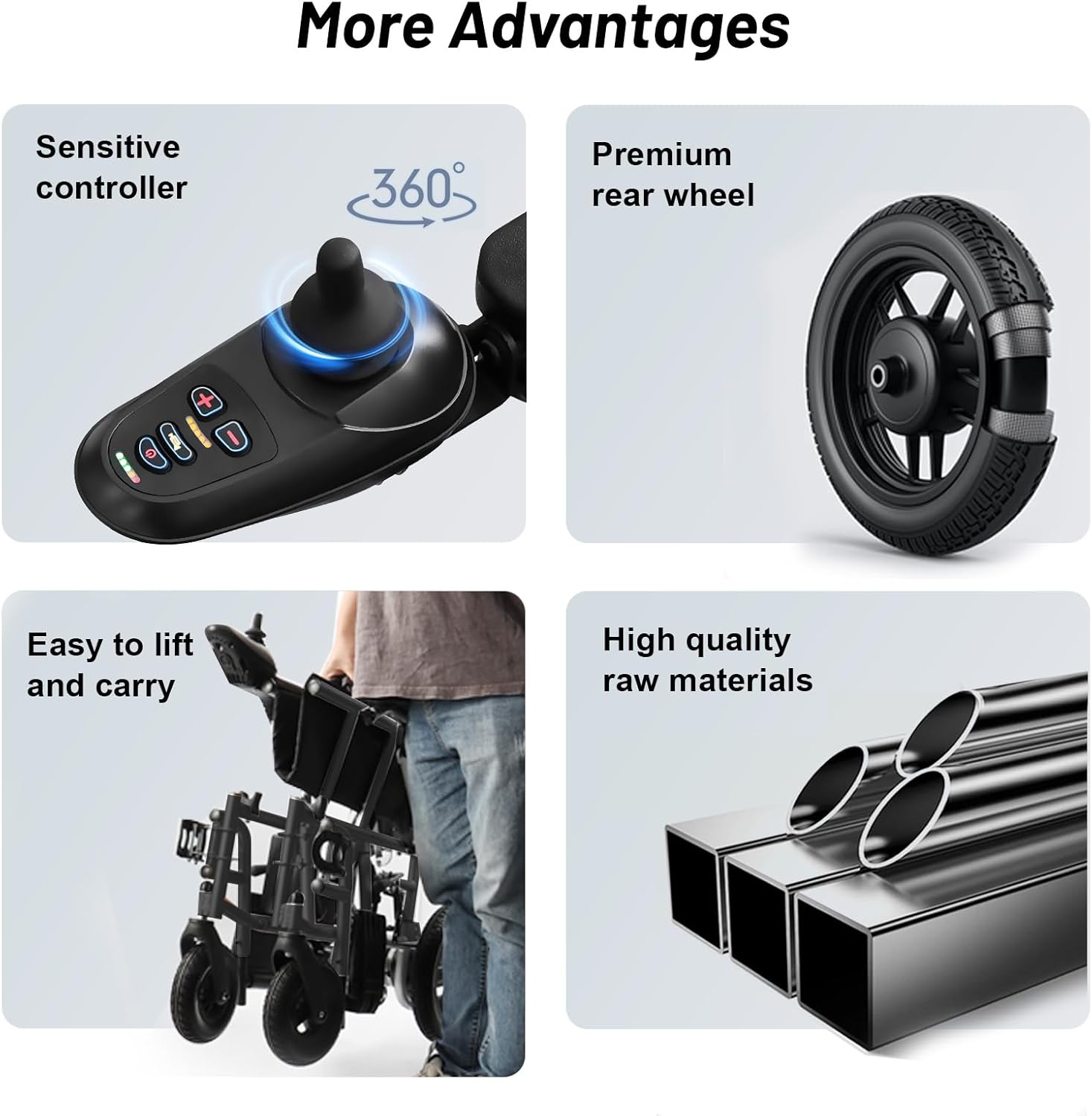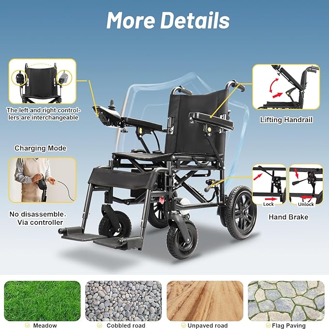 Multi-Terrain electric wheelchair with multiple safety measures, such as parking brake and automatic parking when the control lever is released, to prevent the wheelchair from accidentally sliding on the slope. Manual brake, convenient and quick operation, further ensuring safety. Anti rollover wheels effectively prevent wheelchairs from overturning on uneven roads, providing users with a more stable riding experience. And the battery has overcharge protection function.