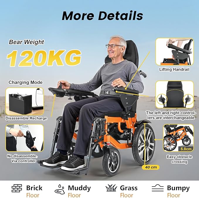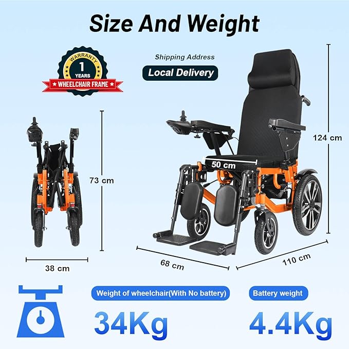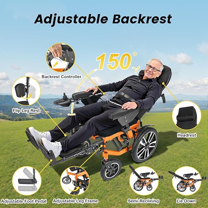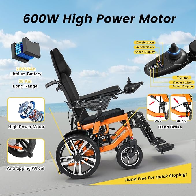 Reclining backrest Electric Wheelchair, Adult Portable (34Kg Without Battery) Mobility Chair, 600W Powerful Motor, 26Ah Lithium Battery, Long Battery Life, Remote Control Operation (Orange)